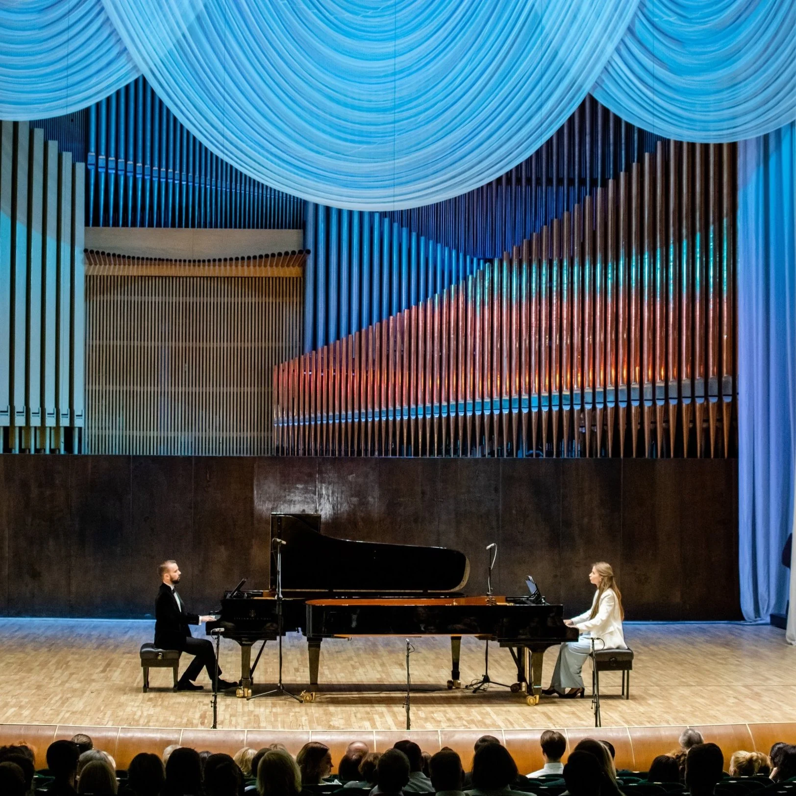 The piano duo of Artiom and Marina Shaplyka has captivated audiences with over 400 performances, spanning nearly every city in their native Belarus. Their artistic journey has taken them across Europe, where they have graced prestigious stages such as Bozar in Brussels, the Vienna Konzerthaus, and various venues in Gijón and Seville, Spain. The duo has also performed at the Theatre of Digital Art (ToDA) in Dubai, in London, and in numerous cities across Poland, Italy, and Lithuania. Their extensive touring history showcases not only their technical mastery and emotional depth but also their unwavering commitment to bringing their music to diverse audiences around the world.